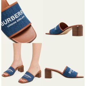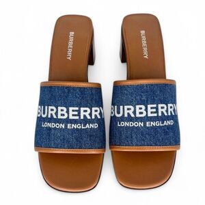 NWT BURBERRY Wilma Logo Blue & Brown Broad Strap Square Open Toe Mules S…
