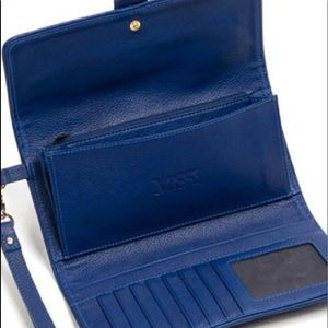 NWT BY MASSI THE BACIO LEATHER WALLET/CLUTCH IN (BLUE). ITS A MATCH MADE IN FASHION HEAVEN WHEN STYLE MEETS FUNCTION. BIGGER (AND MORE SPACIOUS) THAN CONVENTIONAL WALLETS, THIS GENUINE LEATHER WALLET BY MASSI INCLUDES LOADS OF POCKETS FOR YOUR CREDIT CARDS, ID, AND CASH. AND BECAUSE IT INCLUDES A REMOVABLE WRISTLET SYRAP, IT CAN BE UTILIZED AS A CLUTCH DURING A NIGHT ON THE TOWN