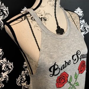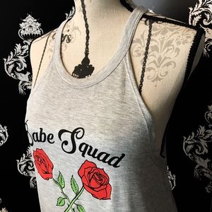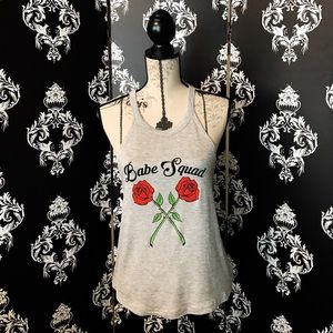 This tank is so stylish and cool with the words "Babe Squad" written on the front with two red roses! I can picture this tank with a black leather jacket, wearing red lipstick and ankle cropped jeans with black ankle boots, but that's just me! π sometimes I see outfits with only one item! π this tank would literally look cute with anything! It's brand new with tags! The tag says Large, but I feel like it would fit better as a medium.