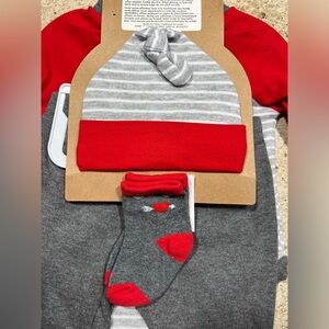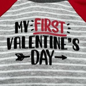 New with tags. 4 piece set includes My First Valentines Day onesie, grey pants, striped hat, and heart socks. Gender neutral design for baby girl or baby boy. Onesie, pants, and hat are 60% cotton, 40% polyester. Socks are 64% cotton, 33% polyester, 3% spandex.