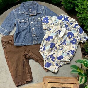 Set includes the Jean jacket, brown jeans and collared snap closure onesie. All brand new with tags. Size 3-6 Months.