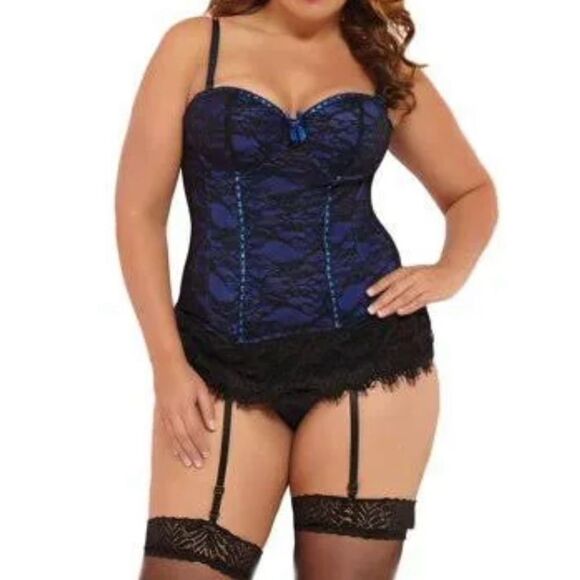 NWT Baci Blue/Black Corset with Garter Belt and Thong Panties - 3X (16-20)