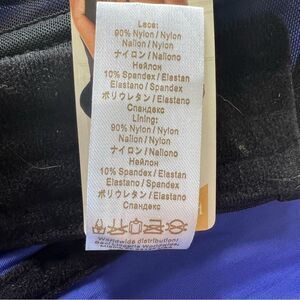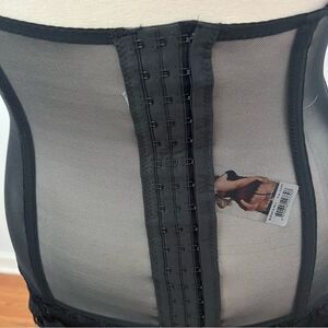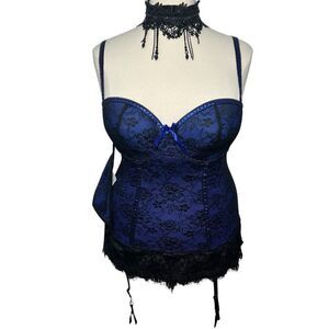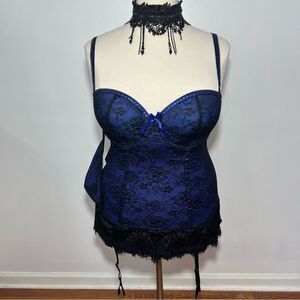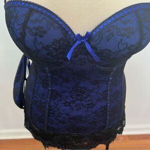 Incredibly sexy! Blue and black lace corset front, see through mesh back. Hook & eye closure, adjustable straps, built in garter belt.