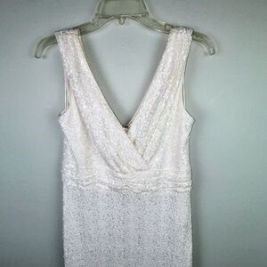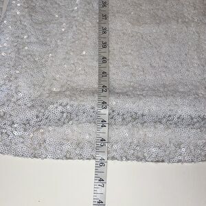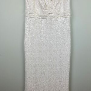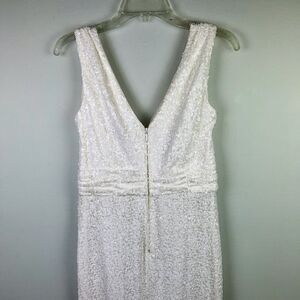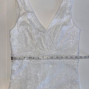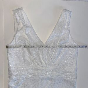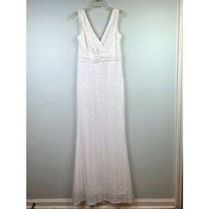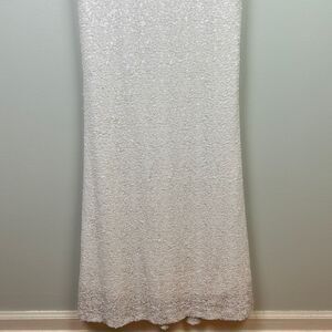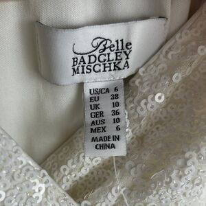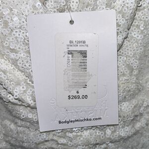 Brand new with tags Badlgey Mischka Belle Bridal gown in winter white. The Carmen wedding dress by Badgley Mischka is fully covered in sparkling miniature sequins and features a crossover front v-neck, sleeveless arms, empire waist with flattering belt like detail under the bust, a figure hugging slightly fit & flare silhouette, and a long floor length skirt. Fully lined, back zipper. Perfect for a bride's special day! NWT. Women's size 6, measurements pictured.