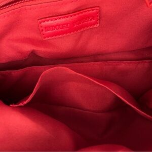 Details: Badgley Mischka Red Handbag Wrapped Frame Clutch has red exterior and matching hardware, this clutch handbag is perfect for any occasion, from formal events to casual outings. The bag is made of high-quality vegan leather and features a detachable strap for versatile styling options. Two pockets inside with one having a zipper.