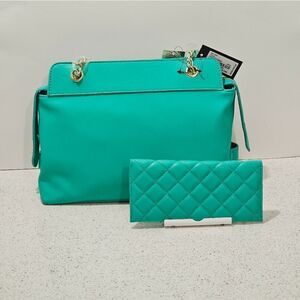 Bag measures 12x8.5x4 inches. Wallet measures 7.5x3.75 inches.
