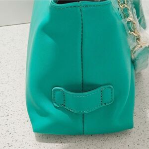straps have chains on both sides with the vegan leather woven through it, and the vegan leather 10.5 inches across the top.