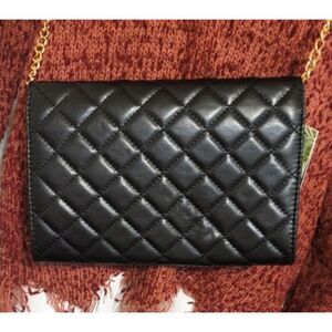 This is a brand new Badgley Mishka small crossbody with diamond quilting. On the fron upper flap there is gold toned studs. The BM Logo holds the twist closure. The drop on the coordinated chain is 21". The chain is not removable but it can be completely hidden inside for the bag to be carried as a clutch. Overall size size is 9"X6"X1" expands to 2". Original MSRP $129.00