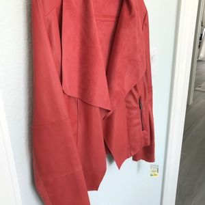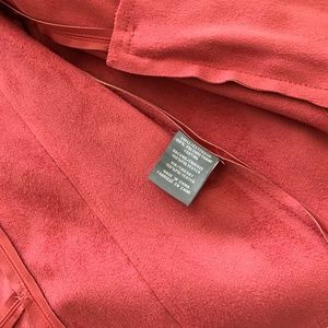 This is a gorgeous soft leather jacket with suede inside and collar; ribbed stretch knit on the back of the sleeves for added comfort and zippered pockets. Muted rosy coral color. Open front so measurements are approximate and taken from back laying flat pit. Original $99