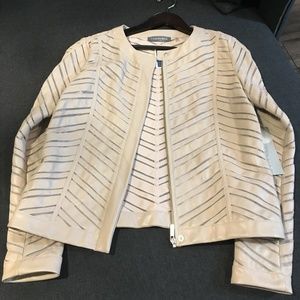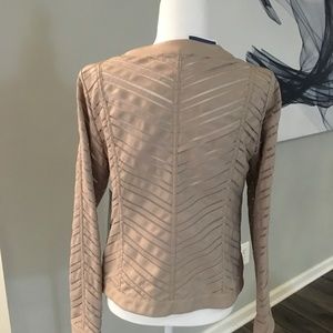 Brand New! Stylish Bagatelle light pink faux leather moto-style jacket! Textured with stripes separated by netting for a chic vision. Round Nehru-style collar with hidden zipper front and top/bottom snaps. Perfect to add a little unexpected sass to a simple pair of skinny jeans or even leather leggings! Size M. 100% Polyurethane. Never worn, tags attached. approx. length 22 in. from shoulder seam to bottom of hem, measured flat. Photo 1 to show style worn; exact product for sale is photos 2-8.