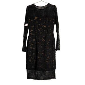 black lace dress, sheath dress, Bailey 44, medium size dress, evening wear, formal dress, lace overlay, women's dress, long sleeve dress, cocktail dress, nylon cotton blend, elegant dress, made in USA, date night, party, event, wedding