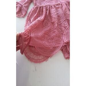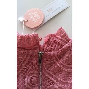 NWT Bailey's Blossoms Boutique beautiful mabel lace dress perfect for any occasion holidays sizing is children's baby size 9 to 12 months the dress is designed it's a beautiful lace sheer Floral vintage style midi knee length long bell sleeve with ruffles ruffled collar zip up back lightweight lined for comfort see photos for extra description Rose Colored scalloped