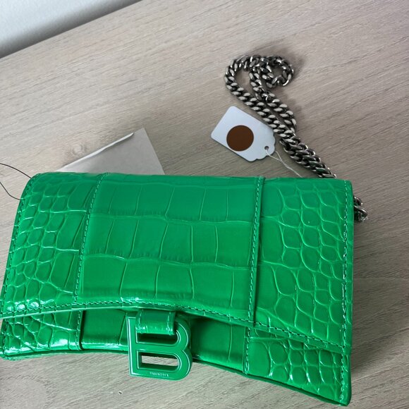 NWT Balenciaga Hourglass Wallet On Chain Shoulder Bag Kelly Green Croc Embossed