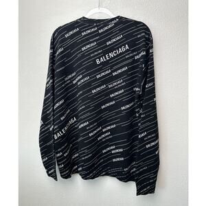 Crewneck sweater in a wool-blend knit with allover diagonal Balenciaga logo intarsia. The front features intentional bleach-effect marks as part of the design. Long sleeves and ribbed collar, cuffs, and hem for a clean finish. Versatile layer that pairs with denim, trousers, or streetwear looks. Identified across retailers as a logo-intarsia wool-blend crewneck style.
