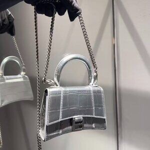 The Balenciaga Hourglass mini bag on chain features a sleek design in croc-embossed leather, offering a refined option for various occasions. With a top handle and a removable shoulder chain strap, it provides versatility in styling.