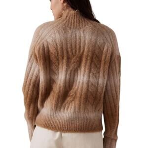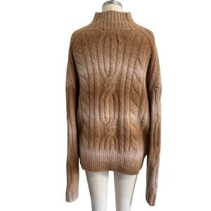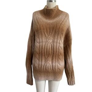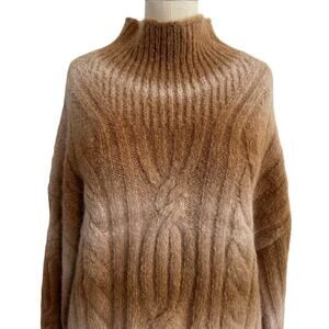 Luxurious alpaca, Italian Yarn, Space-dye soft ombré color unique to each sweater, Cable knit, Loose fit, Dropped shoulder, Moc neck, Long sleeves, Brown/Beige/Cream, 67% Alpaca /37 % Nylon, MSRP $230.
