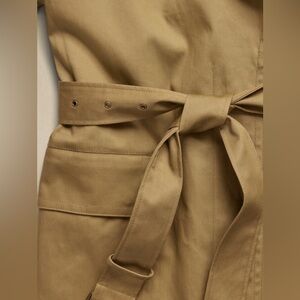 Notch collar with hidden button closure, shoulder epaulettes, and a belted waist with belt loops. Adjustable sleeve tabs.