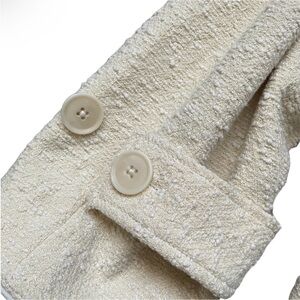 A timeless outerwear piece from Banana Republic, this cream textured oversized jacket combines clean minimalism with elevated detailing. Designed with large functional front pockets, a hidden inside pocket, and statement sleeve buttons, it’s equal parts stylish and practical. The unique collar with button closure detail adds versatility—wear it open for a relaxed look or fastened for structured sophistication.