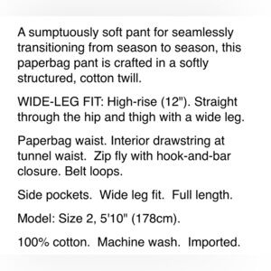 Quality Paperbag pants that are 100% Cotton and are versatile enough to wear year around. New in excellent condition. Please see last picture for added details.