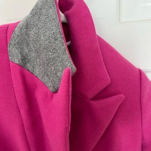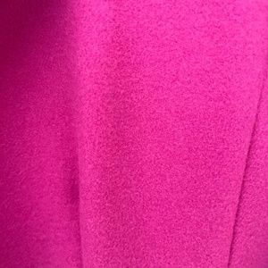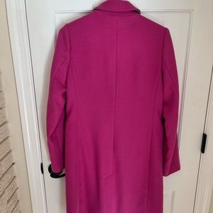 Here is a Banana Republic classic style coat in fuchsia with fuchsia lining. It has 2 buttons in front, 2 pockets with flaps in front (still sewn closed), fuchsia lining, seaming detail, 11" back kick pleat and gray contrast color under the color. The exterior is made of 88% polyester, 11% rayon/viscose and 1% spandex. The lining is 100% elastanne.