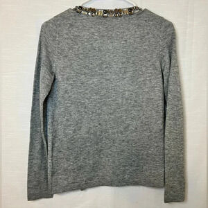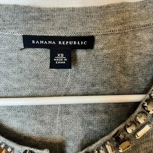 Type: Banana Republic Gray gem embellished collar wool blend cardigan sweater. It is a light cardigan, features large clear gems and silverstone stud along the neckline. One hook closure, 70% polyester, 30% wool.