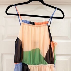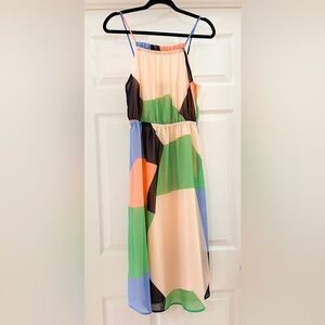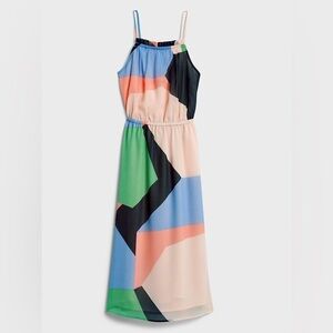 New with tags. Banana Republic KALEIDOSCOPE MIDI DRESS Pink Blue Green. Size XS. Square neck. Adjustable spaghetti straps. Elasticized waistband. All over shirring. Fully lined.