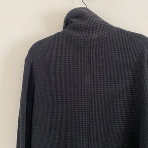 Elegant black zip-up sweater. Features a textured design. Ideal for layering.
