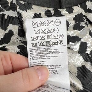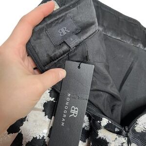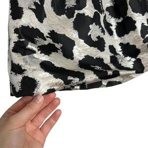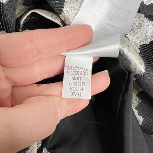 Metallic silver/gold color with a black geometric embossed waistband and allover leopard print. Pockets at sides, zipper and hook closure at back. Has a slight bubble hem. Lined underneath.