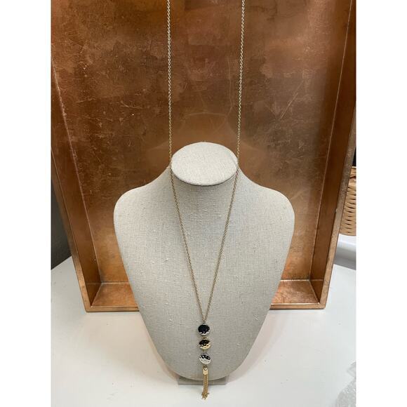 New with tags, Banana Republic Long Gold chain necklace with a two tone, gold and silver hammered 3 circles, 2 silver and 1 gold in the middle. Gold tone tassel at the end.