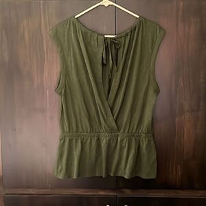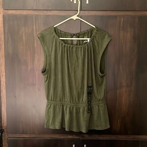 This top is made by Banana Republic. It is an olive green peplum style with a tie at the neck and a cute open back. Size medium and NWT. Smoke and pet free home.