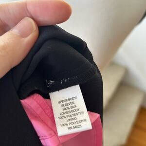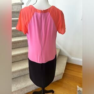 Excellent condition. Pink and orange silk upper with black polyester bottom half. Short sleeves, Scoopneck. Back zipper. Knee length. Shift style.