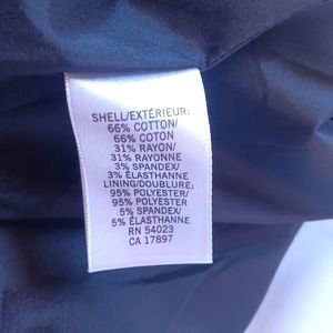 This skirt has pockets and a 3.5"-4.5" waistband. It is a cotton rayon blend with some spandex.