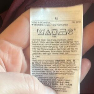 Maroon split neck popover with black center details and black details on cuffs. Longer length. Back hem is longer than the front. 100% polyester. BIN18