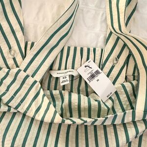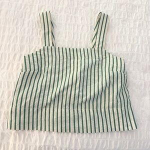 Banana Republic seersucker boxy topstitch tank in green and white stripe. Wide adjustable straps, square neck, elastic band in back. Straight hem.