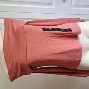 Elegant off-shoulder sweater in a warm rusted orange hue. Perfect for a stylish and cozy look. Strechy fabric, long cuffed sleeves, ptp 21" flat, length 18". Can be worn off shoulder or as a cowl neck.