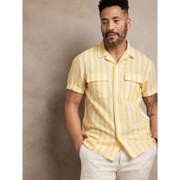 NWT Banana Republic Stripe Resort Shirt Linen Cotton Yellow White Striped M Tall