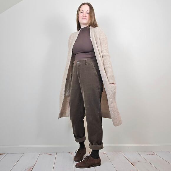 Beige teddy or sherpa textured open front long duster style cardigan sweater. Oversized fit. Front pockets. 43% wool, 24% nylon, 22% alpaca, 10% acrylic, 1% spandex/elastane. Retailed for approximately $138.