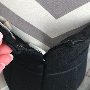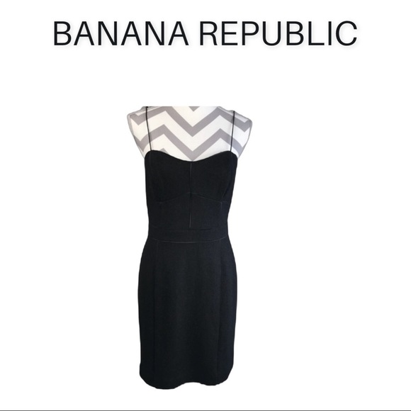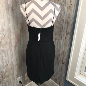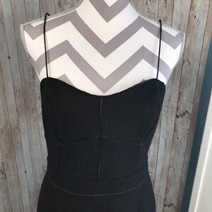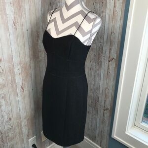 Wool blend dress with piping accents and thin spaghetti straps. Hugging style with kick slit. Zippered back closure with hook/eye