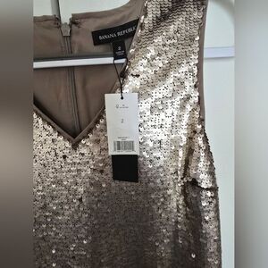 Elevate your evening with this stunning gold sequin sheath dress from Banana Republic. Designed for cocktail nights or clubbing it features a sophisticated V-neckline and a sleek sleeveless silhouette. Perfect for formal occasions, this dress exudes elegance and style.