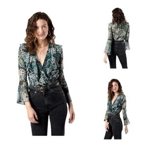 Tags: floral, flowers, paisley, bonnie, emerald, gem, v-neck, plunging neckline, dainty, boho, bohemian, festival, concert, ruffle, ruffled, ruffles, bell sleeve, bodysuit, one piece, classy, closet staple, capsule wardrobe.