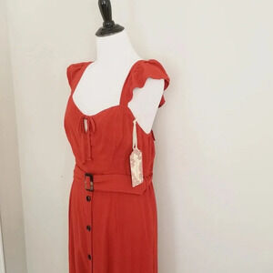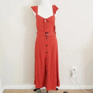 New with Tags Band of Gypsies for Nordstrom Honeysuckle midi dress in terra cotta orange. Buttons down front. A wide belt cinches the waist of this sweetly ruffles midi made from a lightweight linen blend. Sleeveless. Smocked back panel. Removable buckle belt.