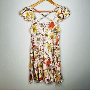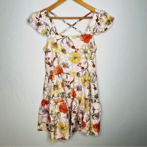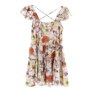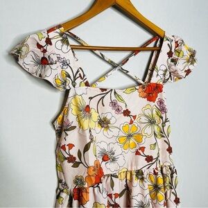 New with Tags! (Still in plastic wrapping from retailer). Band of Gypsies (B.O.G. Collective) Lottie & Holly Blush Rust Criss-Cross-Back Ruffle-Sleeve Tiered Floral Square-Neck Mini Dress. Size Medium. Please see photos for measurements and material content.
