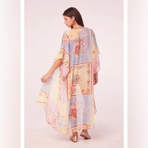 Wilder Floral Kimono Duster by Band of the Free. Vintage-inspired and whimsical chiffon duster. Open front. High-low hem. Poly fabrication in powder blue, pink, and yellow with floral details. Sized an XS/S, but very forgiving per the measurements. Can possibly fit up to a medium! Dreamy kimono duster in lovely spring/summer colors!