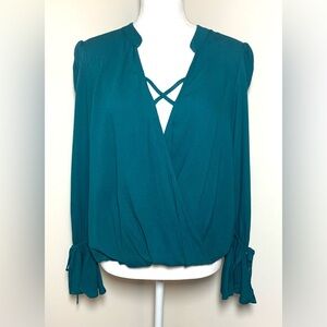Beautiful shade of green. Faux wrap style, criss cross V-Neckline. Flutter cuffs with ties.