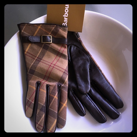 NWT Barbour women's brown leather gloves with one of their signature tartan/plaid patterns on the outer side. Beautiful and soft dark brown leather on the inner side. Small white thread is visible on the left glove index finger, but not noticeable unless you know where to look for it (see picture). The ruler is difficult to see, but the glove measures approx 8.5" at the longest point x 3.5" wide at the bottom with a 4.5" long thumb. Never worn. Make an offer! Make a bundle and save 20%! 🎉