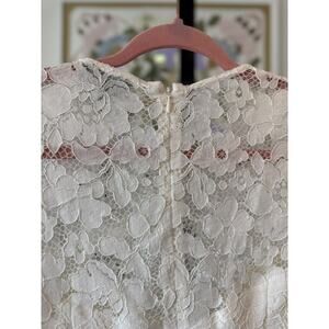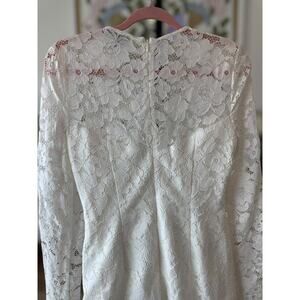 Delicate lace detailing and sheer long sleeves create an elegant, romantic look with modern flair. The scalloped hem and tailored fit add a touch of sophistication, perfect for special occasions or evening events.