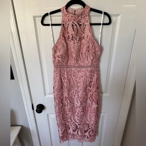 The Isa Dress features a halterneck silhouette with fitted body, embroidered lace overlay, defined waist, fully lined skirt, keyhole back closure and invisible zip entry.