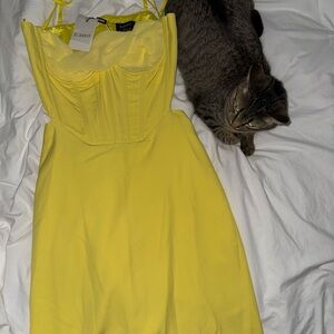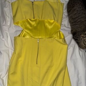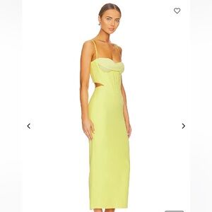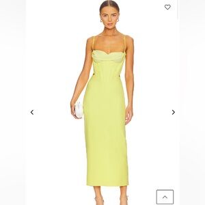 Chic Bardot midi dress in a bright lemon hue. Features a fitted bodice and elegant silhouette. Ideal for any stylish occasion.