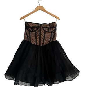 Elegant strapless dress with a black mesh overlay and nude lining. Perfect for special occasions.