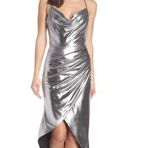 A sultry cowl neckline sets the stage for this figure-skimming dress in a beautifully gathered, faux-wrap silhouette with a leg-flashing tulip hem.28" shortest length; 38" longest length (size Medium) Back zip closure Cowl neck Adjustable shoulder straps Lined 100% polyester Hand wash, dry flat